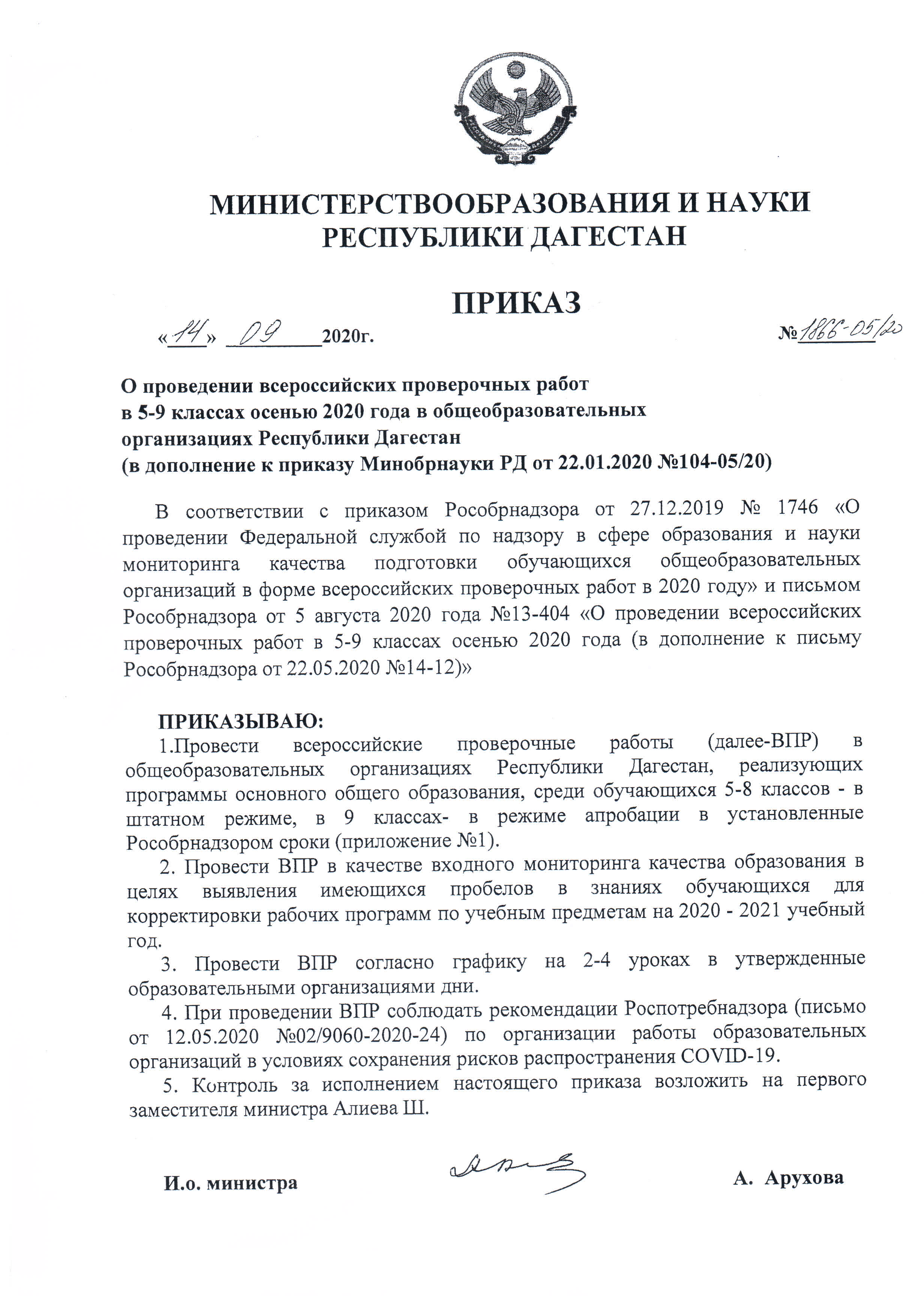 О проведении всероссийских проверочных работ в 5-9 классах осенью 2020 года в общеобразовательных организациях Республики Дагестан (в дополнение к приказу Минобрнауки РД от 22.01.2020 №104-05/20)
