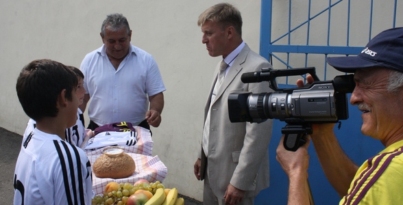 Делегацию встретил директор ГБОУ "РДЮСШ" Александр Маркаров с хлебом солью, фруктами и подарочными именными футболками. Первым пунктом знакомства со школой стало посещение полей, где к моменту прибытия делегации в футбол играли сразу несколько команд из числа воспитанников РДЮСШ.