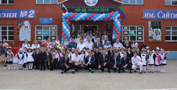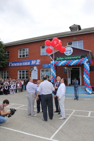 Поздравлять с Днем знаний министр начал с посещения гимназии №2 им. А.М. Сайтиева. Дорогих гостей в школе встречали хлебом и солью, а также приветственной лезгинкой в исполнении танцевального ансамбля гимназии.