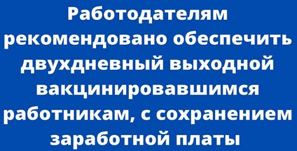 В соответствии с перечнем поручений Президента РФ по итогам совещания с членами Правительства РФ от 20 октября 2021 года, работодателям рекомендовано обеспечить двухдневный выходной вакцинировавшимся работникам, с сохранением заработной платы