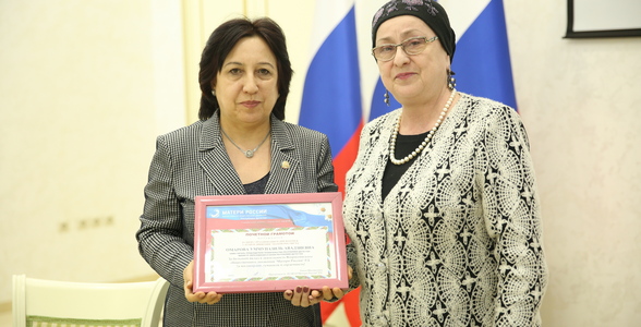 В завершении встречи Председатель регионального отделения движения «Матери России» Таисия Магомедова вручила вице-премьеру - министру образования и науки РД Уммупазиль Омаровой Почётную грамоту «За большой вклад в деятельность Всероссийского общественного движения «Матери России» РД. За милосердие, гуманность и сердечность».