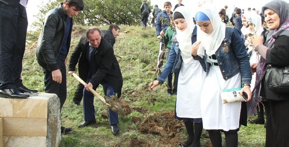 Агитбригада Чиркейского лицея выступила с темой «Дети мира, возьмитесь за руки!». После выступления все участники акции приступили к посадке плодовых саженцев и установке фундамента под памятник.