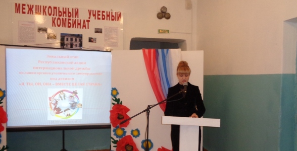 Во исполнение мероприятий Комплексного плана противодействия идеологии терроризма в Российской Федерации на 2013–2018 годы в Республике Дагестан и государственной программы Республики Дагестан «О реализации Комплексной программы противодействия идеологии терроризма в Республике Дагестан на 2015 год», а также в целях сохранения и укрепления межнационального мира и согласия, единства и дружбы народов Дагестана 28 октября 2015 г. в городе Кизляре на базе учреждений дополнительного образования - Межшкольного учебного комбината и Дома детского творчества прошёл заключительный этап республиканской акции интернациональной дружбы по линии органов ученического самоуправления под девизом «Я, Ты, Он, Она – вместе целая страна». Инициатором акции выступило Министерство образования и науки Республики Дагестан, которое оказало финансовую поддержку в проведении данного мероприятия.