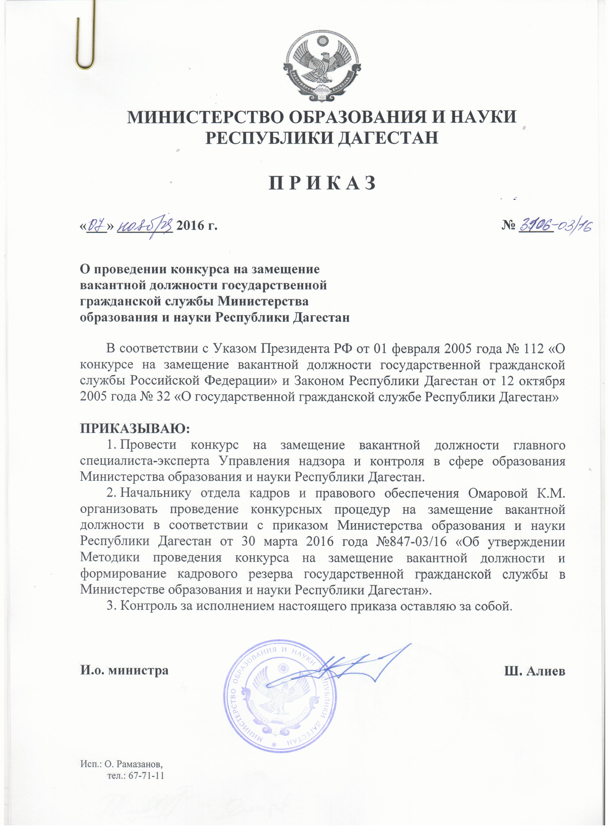 О проведении конкурса на замещение вакантной должности государственной гражданской службы Министерства образования и науки Республики Дагестан